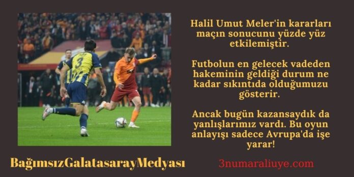 Galatasaray’ın galip olduğu anlara dönersek Galatasaray’ın diğer ezeli rakiplerinden olumsuz bir farkı ortaya çıkıyor. Galatasaray, öne geçtiğinde rakibin gardını düşüremiyor, hatta rakipleri geriden gelebiliyor. Ancak rakipleri öne geçtiğinde bu durum tam tersi oluyor. Zamanı, topu ve gerginliği maalesef ki rakip takımlar daha iyi yönetiyor. Bugün de çıkan kadro ve oyun anlayışına rağmen, o rahatlıkta ilk golü atan, başka bir takım olsaydı, farka yürüme şansını kullanırdı. Biz ise hakem eliyle de olsa mağlubiyete yürüdük. Bu eksikliği ligin en tecrübeli hocasıyla yaşıyorsak durup düşünmemiz lazım.